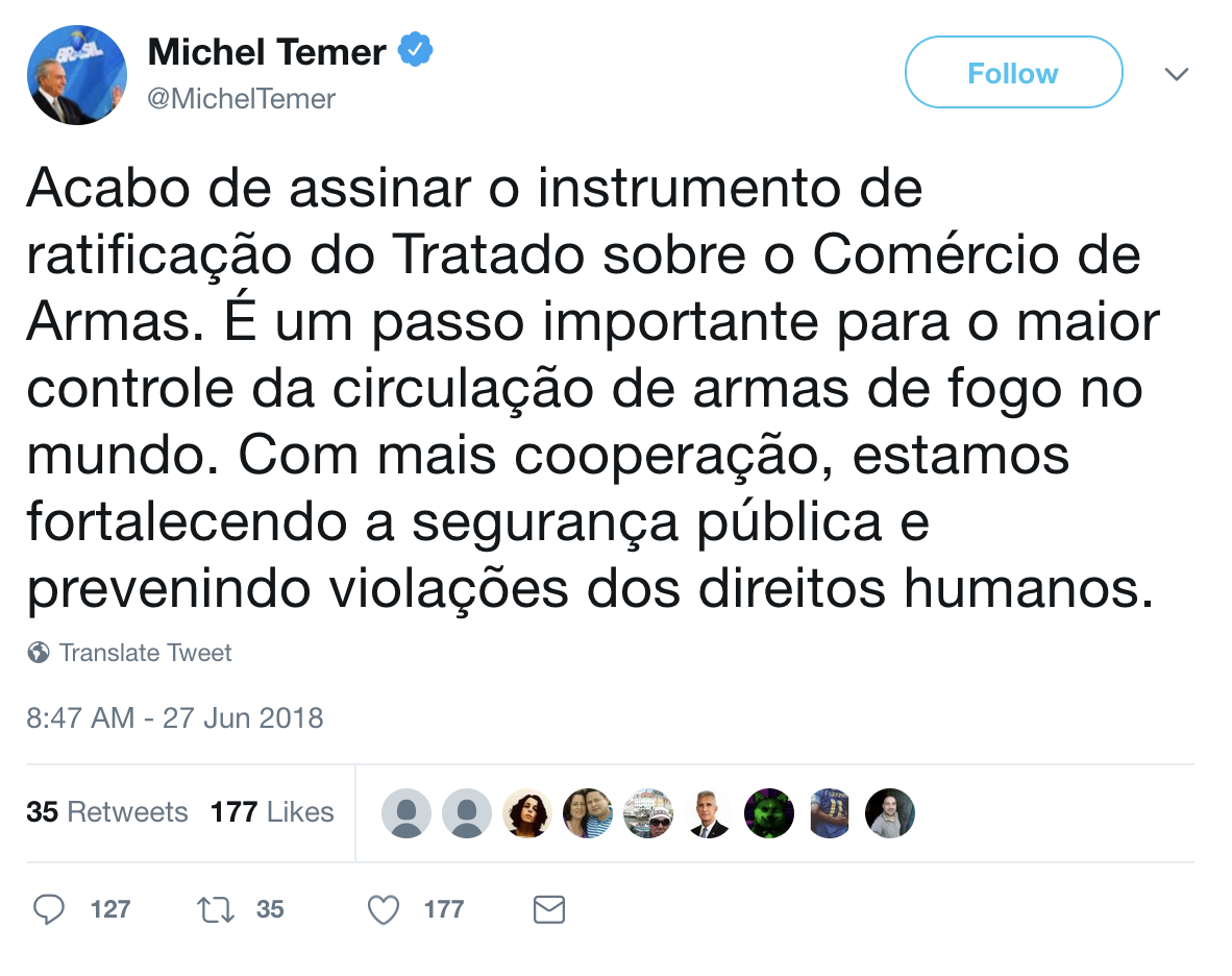 President Temer Tweeted: “I have just signed the instrument of ratification of the Arms Trade Treaty. It is an important step for a better control of firearms circulation throughout the world. With more cooperation, we are strengthening public security and preventing human rights violations.”