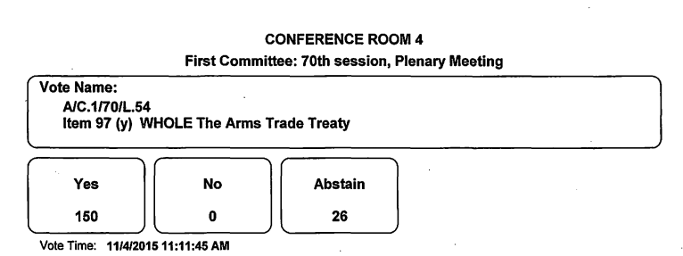 On 4 November, the UN First Committee adopted the Arms Trade Treaty Resolution (UN L.54). 150 States voted in favour of the resolution, with zero opposed and 26 abstentions.