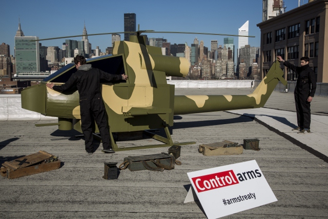 On the penultimate day of the ATT negotiations, we got the media’s attention early morning with a helicopter assembled on a New York rooftop, with the UN in the background.