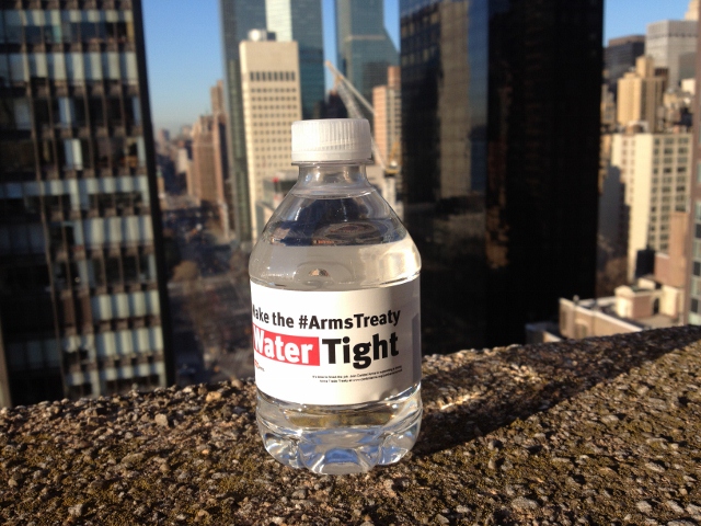 Campaigners passed out bullet shaped cookies to encourage delegates to “bite the bullet” and agree a strong ATT. This morning we handed out water bottles urging them to agree on a water tight treaty.